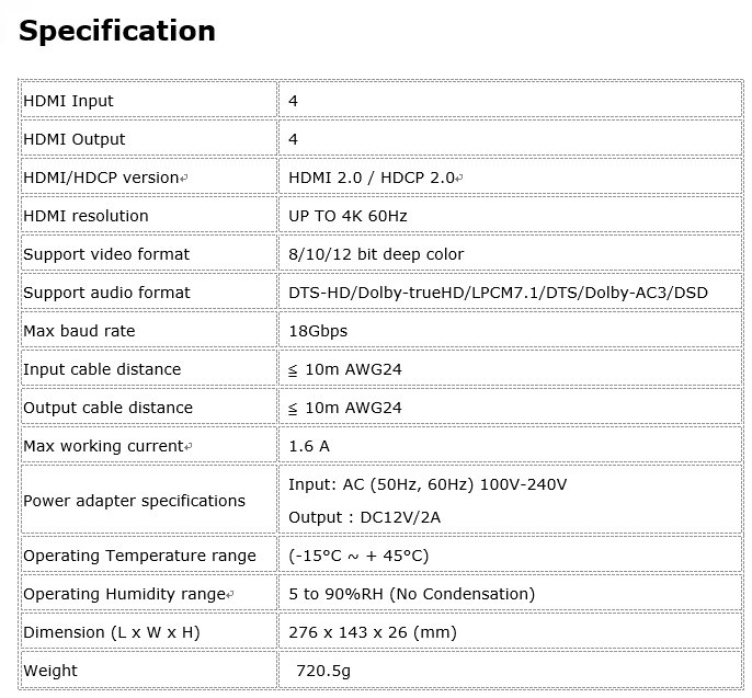 The HDMI 2.0 Matrix 4x4 can connect four HDMI signal sources with the four displays at the same time. It can easily and freely split or switch four HDMI signals on four displays or projectors which compatible with HDMI signal. Extra infrared receiver extension, IR emitter, RS232 are supplied for remote control.